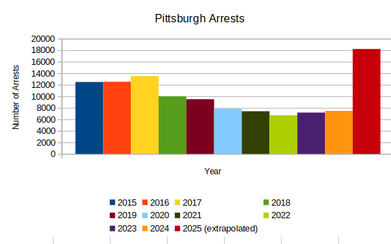 A look at the Pittsburgh Bureau of Police monthly dashboard reveals that the department is on track to arrest over twice as many people in 2025 as in 2024. The monthly arrest totals from January through October of this year add up to 15,172. Extrapolating through December yields over 18,000 arrests, compared to 7,476 in all of 2024. It is not yet clear what is driving the increase, but we can rule a few things out. It’s not a two and a half fold increase in crime that began precisely on January first. The mainstream media would have been screaming […]