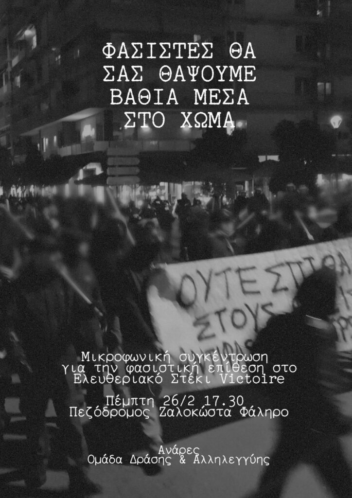 Συγκέντρωση για τη φασιστική επίθεση στο Ελυθεριακό Στέκι Victoire, Πεμπτη 26/2 , Πεζόδρομος Ζαλοκώστα, Φάληρο 17:30 (Ανάρες – Ομάδα Δράσης & Αλληλεγγύης)