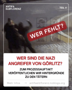 Rückblick: Ende Dezember 2024 überfallen in Görlitz mehrere Neonazis eine Gruppe Antifaschist:innen, darunter Mitglieder der Partei DIE LINKE. Der Angriff ist geplant und gut orchestriert, es wird von mehreren Seiten attackiert. Die Täter sind mit Pyrotechnik, Schlaghandschuhen und Glasflaschen bewaffnet. Drei Antifaschist:innen werden verletzt und müssen im Krankenhaus behandelt werden. Der Vorfall zieht bundesweite Aufmerksamkeit nach sich, weil Finley Pügner beteiligt war. Vor Kurzem begann der Prozess gegen drei der Angreifer, gegen weitere Beschuldigte wird ermittelt. Wir zeigen euch heute nach Schulz, Dittrich, Kreuziger und Pügner die restlichen Täter