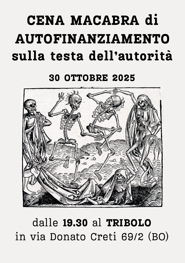 Diffondiamo: Giovedì 30 ottobre cena macabra di autofinanziamento sulla testa dell’autorità. Dalle 19:30 al Tribolo in via Donato Creti 69/2, Bologna.