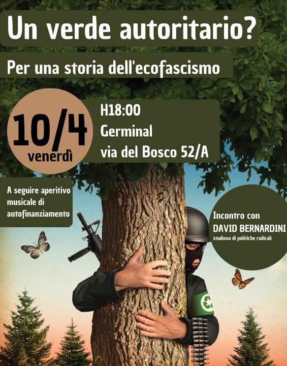 Esiste nella destra un preciso discorso sulla natura che dice molto della sua concezione della società e che parla la lingua dell’autoritarismo, dell’organicismo e della comunità escludente. Dalle cosiddette correnti verdi del fascismo fino all’attuale ecobordering, ripercorrere la storia dell’ecofascismo è il primo passo per capirlo e saperlo affrontare. Ne parliamo con David Bernardini studioso delle culture politiche radicali a seguire aperitivo chiacchiere e musica