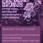 🕓 Start at 11.30 AM until ~3 PM 🏴 International women’s day! We are inviting everyone to honour March 8th together with a brunch at Infoladen. Bring along your friends, favourite texts associated with the occasion and some vegan food to share. We can prepare some posters for demo together as well as write letters to those who are still imprisoned. See you in the hood! To which demo is it going? Find out at the place :))