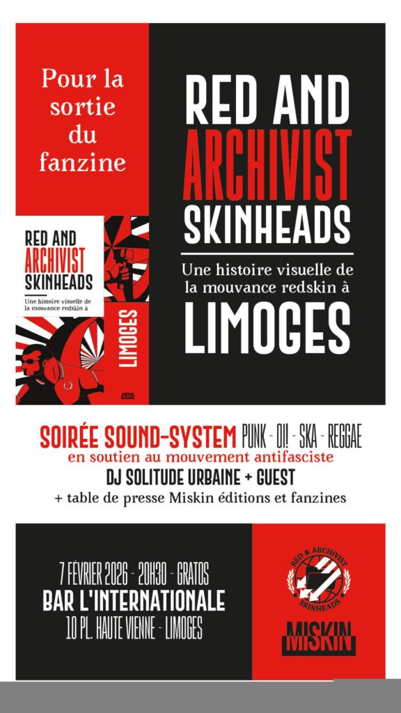 Afin de fêter dignement la sortie du fanzine Red and Archivist SkinHeads – Une histoire visuelle de la mouvante redskin à Limoges, les éditions Miskin vous invitent le samedi 7 février au bar L’Internationale (à Limoges).Rencard à partir de 20h30 pour une présentation du fanzine suivi d’un dj set animé par Solitude Urbaine. Les fonds récoltés lors de la soirée serviront à soutenir la lutte antifasciste.Le zine sera disponible sur la table des éditions, accompagné d’une sélection d’autres fanzines.Ramenez-vous ! Pour rappel, Red and Archivist Skinheads est une collection de fanzines consacrée à la mémoire visuelle du mouvement redskin en […]