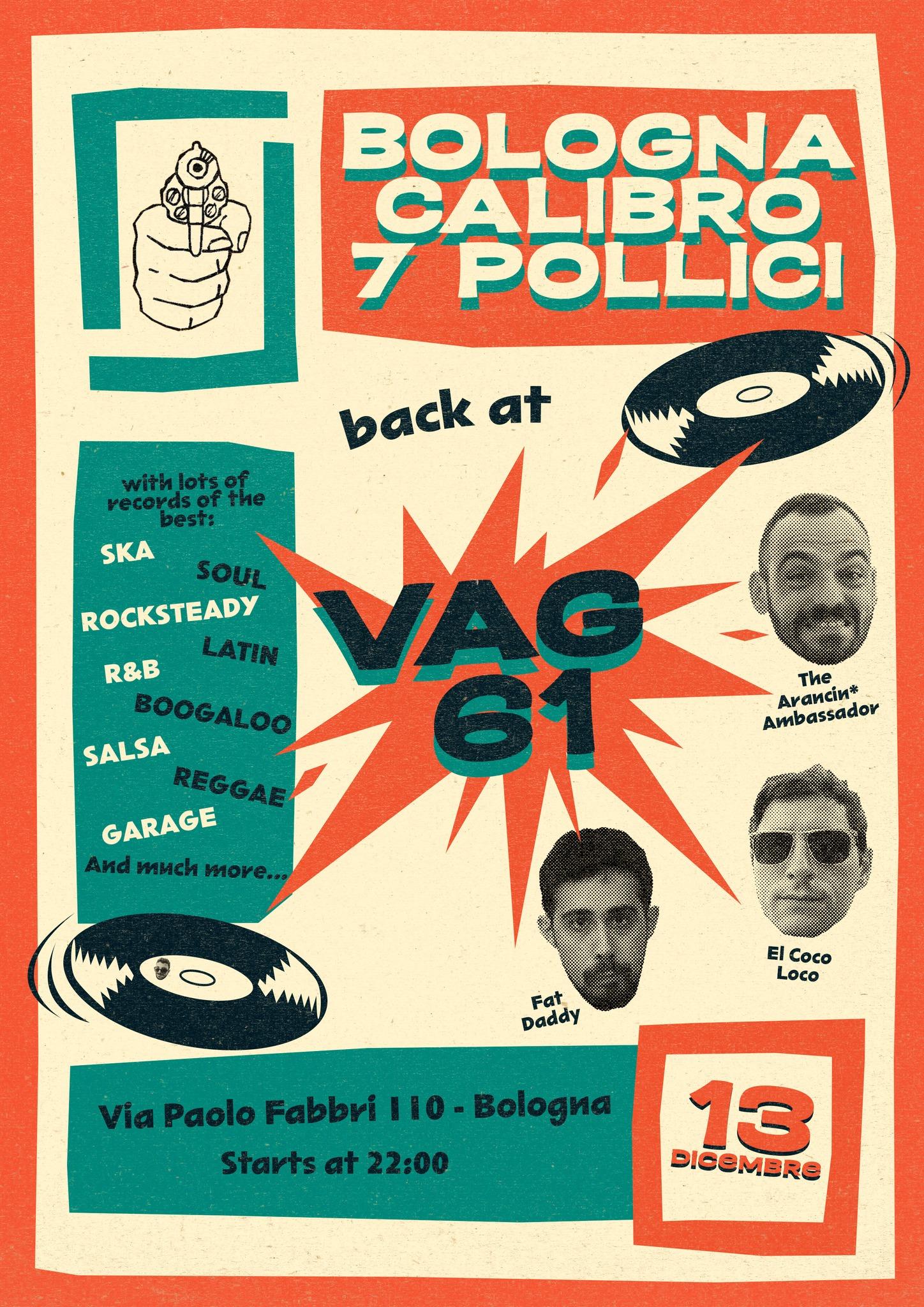 SABATO 13 DICEMBRE’025 Bologna Calibro 7 Pollici il 13 Dicembre ritorna al @vag61 di via Paolo Fabbri 110! Noi siamo emozionatissimi e non vediamo l’ora di farvi ballare il meglio del reggae, soul, r&b, latin, garage, gospel, funk, ska e rocksteady su vinile 45 giri e LP. Vi aspettiamo in pista dalle 22:00 con scarpette luccicanti e sorrisi stampati in facciaBologna Calibro 7 Pollici resident dj’s:Michele, Federico e Salvo.******************************************************************LOCATIONVAG61Via Paolo Fabbri 110, Bologna******************************************************************INGRESSO UP TO YOU!PLEASE COME EARLY!