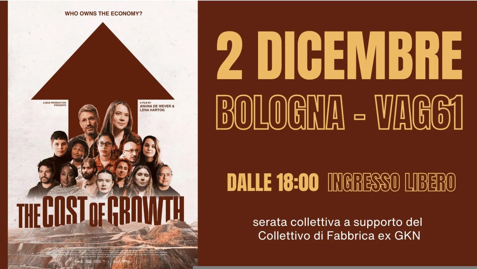 MARTEDI’ 2 DICEMBRE’025 Iniziativa in collaborazione con Bologna for Climate Justice Come si collegano le lotte contro l’estrattivismo e quelle in difesa del lavoro e dei diritti sociali? Come costruiamo alternative capaci di realizzarsi sulla scala locale e incidere su quella globale? Ne parleremo martedì 2 dicembre a VAG61, durante una serata che ospiterà una delle anteprime italiane del documentario The Cost of Growth, e un momento di confronto a più voci verso il 2026. L’iniziativa è organizzata in collaborazione con Voice Over Foundation. Serata collettiva a supporto dell’azionariato popolare del Collettivo di Fabbrica ex GKN. PROGRAMMA 18:00 | Bologna, convergenze ed ecologie: sguardi collettivi […]