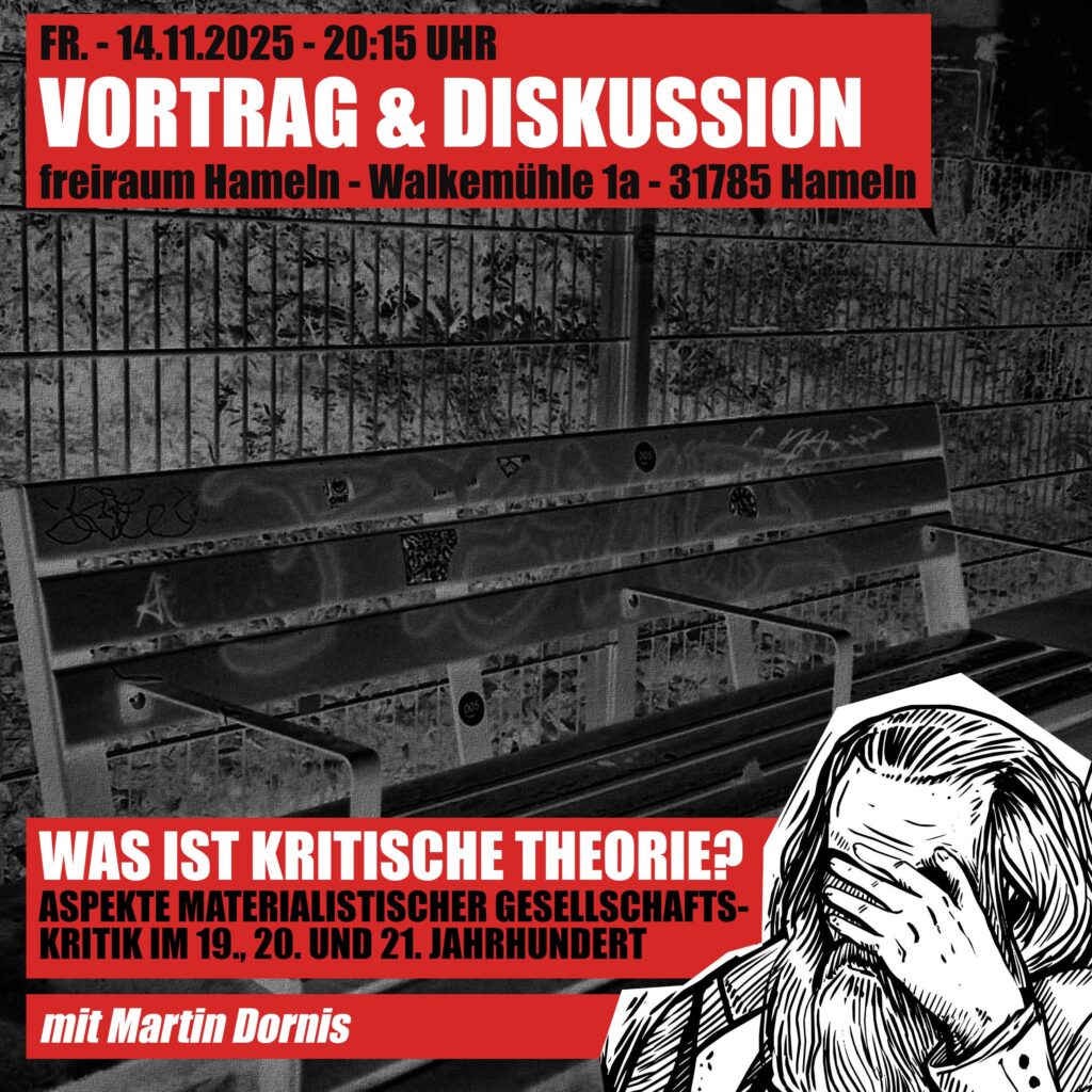 Am Freitag, den 14.11.2025, findet im freiraum Hameln (Walkemühle 1a, 31785 Hameln) ab 20:15 Uhr ein Vortrag samt anschließender Diskussion mit Martin Dornis zum Thema: „Was ist kritische Theorie – Aspekte materialistischer Gesellschaftskritik im 19., 20. und 21. Jahrhundert“ statt, auf den wir an dieser Stelle sehr gerne hinweisen. Den ausführlichen Ankündigungstext dokumentieren wir zudem nachfolgend: Was ist kritische Theorie?Aspekte materialistischer Gesellschaftskritik im 19., 20. und 21. Jahrhundert Die Weltgesellschaft befindet sich momentan in einer „multiplen Krise“, die sich auf unterschiedlichste Weise zeigt. Um nur einige Krisenerscheinungen zu nennen:• drohende autoritäre Herrschaft, eine mögliche Wiederkehr des Faschismus und wachsende Zuwendung […]