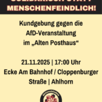 Aktionsbündnis Landkreis Oldenburg (AbLakOl) schreibt: „Das „Aktionsbündnis Landkreis Oldenburg“ ruft für Freitag, 21.11.2025, um 17:00 Uhr zu einem Protest an der Ecke Am Bahnhof / Cloppenburger Straße gegenüber dem „Alten Posthaus“ in Ahlhorn auf. Anlass ist eine Veranstaltung mit den AfD-Bundestagsabgeordneten Andreas Paul, Martin Sichert und Dirk Brandes. Einlass zum Treffen in dem Restaurant „Altes Posthaus“ soll ab 17:30 Uhr sein. Dieser Flyer wurde großflächig im Landkreis Oldenburg über einen Posteinwurf an die Haushalte zugestellt. Dabei handelt es sich um ein neuartiges Vorgehen zur Veranstaltungsankündigung und es ist ein weiterer Schritt zur Normalisierung der AfD. Diese Einladung, der vermutlich bis…