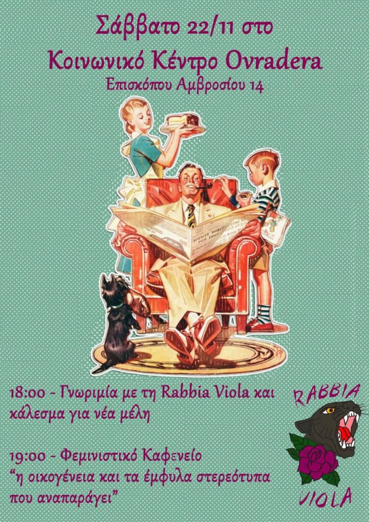 Στις 18:00 θα πραγματοποιηθεί γνωριμία με τη συλλογικότητα και συζήτηση με όσα άτομα ενδιαφέρονται να γίνουν μέλη της.Στις 19:00 θα ακολουθήσει φεμινιστικό καφενείο με θέμα “Η οικογένεια και τα έμφυλα στερεότυπα που αναπαράγει”. ** Στον χώρο κατά τη διάρκεια του καφενείου θα λειτουργεί μπαρ και θα υπάρχουν ζεστά ροφήματα.