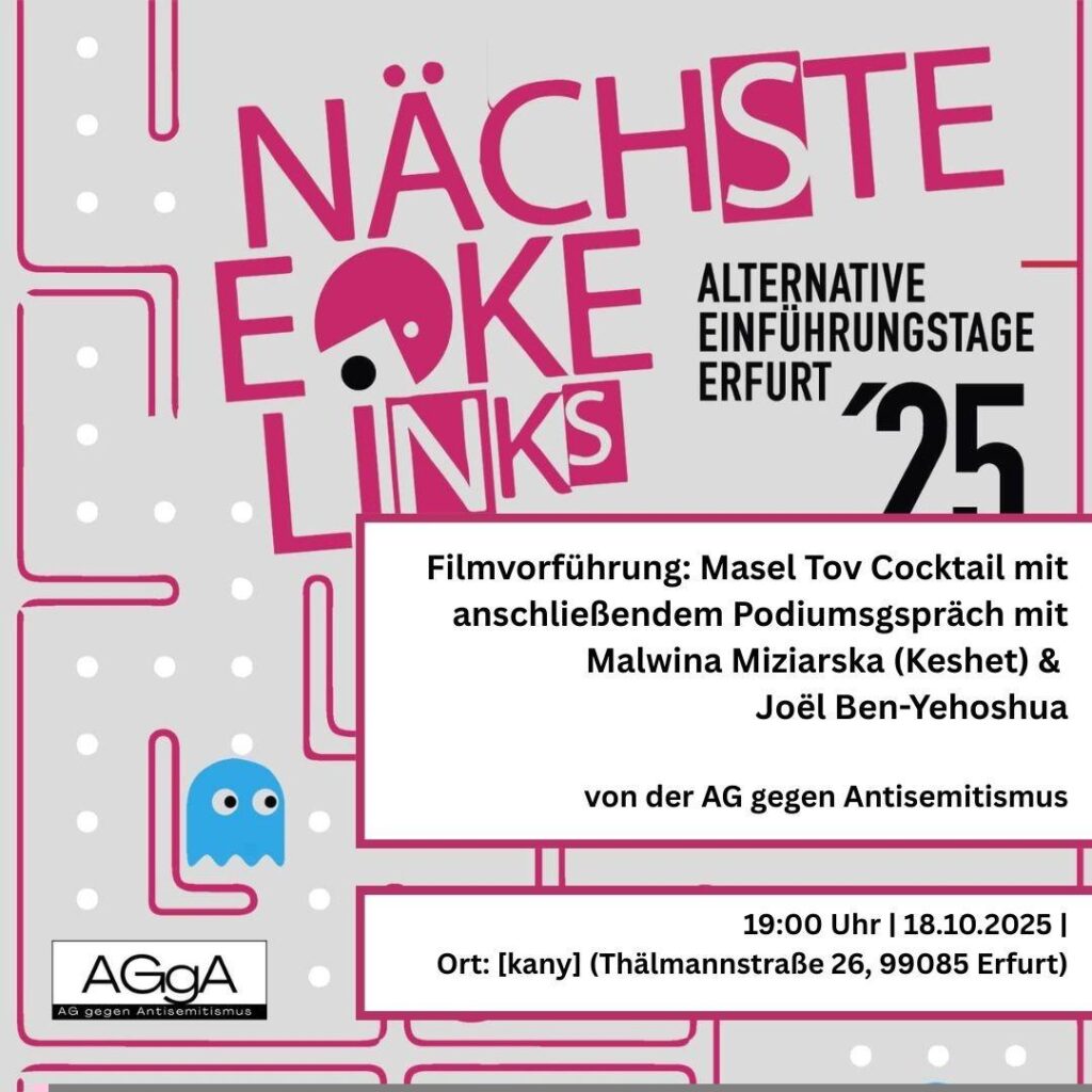 [kany] (Thälmannstraße 26, 99085 Erfurt) I 18.10.2025 I 19:00 Dima ist wütend. Wütend darüber, dass sich sein Leben in erster Linie um eines zu drehen scheint: seine jüdische Identität. Der Film „Masel Tov Cocktail“ gewährt Einblicke in seinen Alltag, der gezeichnet ist durch Geschichtsvergessenheit, Viktimisierung, Schuldabwehr und Antisemitismus. Auch unsere Podiumsgäst*innen Malwina Miziarska (Keshet) und Joël Ben-Yehoshua sind in ihrem Alltag mit diesen Themen konfrontiert. Gemeinsam mit ihnen wollen wir den Film schauen und im Anschluss besprechen.
