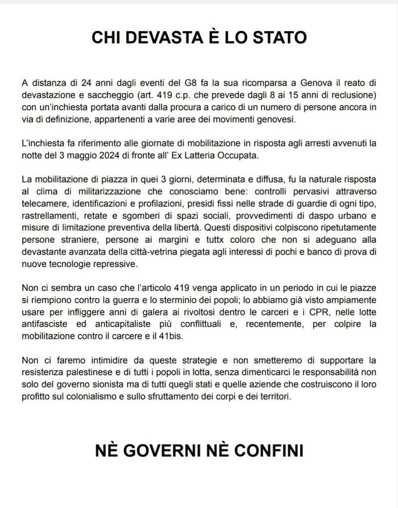 Diffondiamo: A distanza di 24 anni dagli eventi del G8 fa la sua ricomparsa a Genova il reato di devastazione e saccheggio (ad 419 c.p. che prevede dagli 8 ai 15 anni di reclusione) con un’inchiesta portata avanti dalla procura a carico di un numero di persone ancora in via di definizione, appartenenti a varie aree dei movimenti genovesi. L’inchiesta fa riferimento alle giornate di mobilitazione in risposta agli arresti avvenuti la notte del 3 maggio 2024 di fronte all’Ex Latteria Occupata. La mobilitazione di piazza in quei 3 giorni, determinata e diffusa, fu la naturale risposta al clima di […]