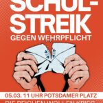 Aufruf von Schulstreik gegen Wehrpflicht Berlin Trotz über 50.000 SchülerInnen auf der Straße wurde die Wehrpflicht beschlossen.Das zeigt wieder klar:Die Reichen wollen krieg – die Jugend eine Zukunft!Wir kämpfen weiter und sehen uns auf der Straße! Am 5.3. um 11 Uhr Potsdamer Platz! Gründe vorher ein Streikkomitee an deiner Schule und komm zu unseren Vernetzungstreffen jeden Donnerstag um 18 Uhr. Mehr Infos, How To Schulstreik und Material: https://schulstreikgegenwehrpflicht.com/