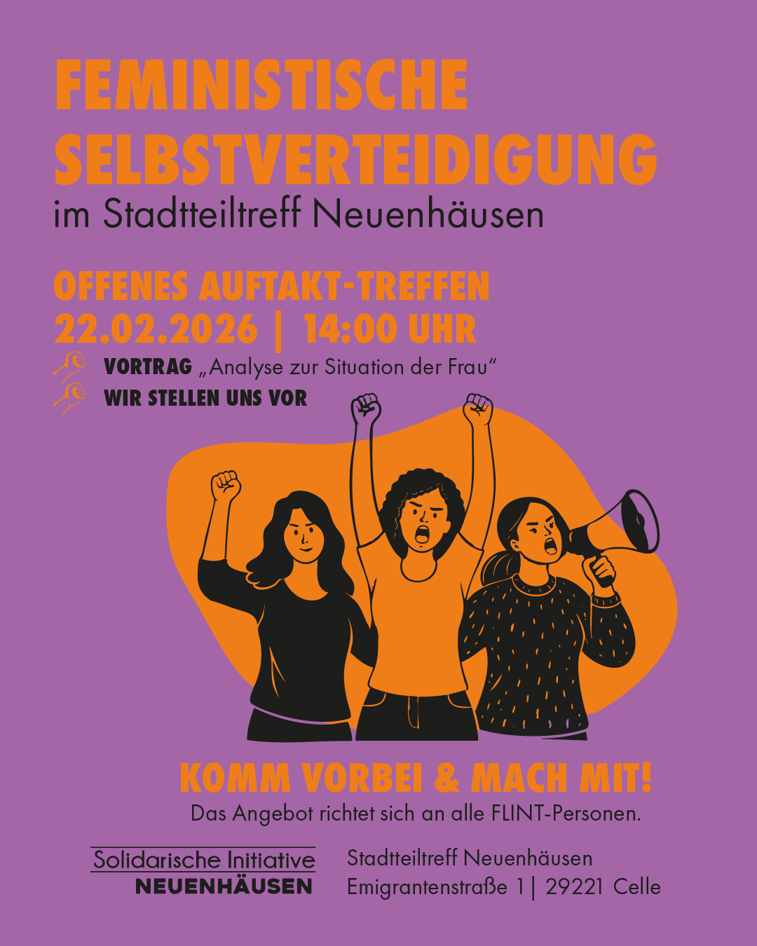 ✴️ FEMINISTISCHE SELBSTVERTEIDIGUNG ✴️ Um was geht‘s?Wir wollen uns zusammenfinden, um uns mit dem Thema Selbstverteidigung zu beschäftigen sowie gemeinsam und voneinander zu lernen. Wogegen wollen und müssen wir uns im Patriarchat verteidigen? Wie können wir das tun? Wie können wir uns gegenseitig dabei unterstützen? Mit unserem Auftakt-Treffen möchten wir Interessierte zusammenbringen, ins Gespräch kommen, euch einladen unsere Initiative zu begleiten ‒ teilnehmend oder mitgestaltend. Was heißt „flint-Personen“?Unsere Einladung richtet sich an FLINT-Personen. FLINT steht für Frauen, Lesben, Intergeschlechtliche, Nicht-binäre und Trans-Personen ‒ also Menschen, die aufgrund ihrer geschlechtlichen Identität im Patriarchat diskriminiert werden. Komm zum Treffen am 22.02.2026! Du […]