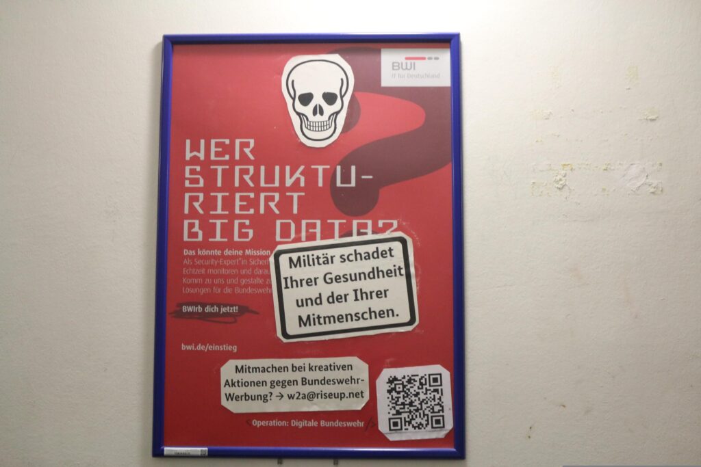 Ein Totenkopf? So hatte sich die Bundeswehr das mit der Werbung in der TU Berlin sicher nicht vorgestellt. Seit Anfang der Woche sucht dort der bundeswehr-eigene IT-Dienstleister BWI mit Plakaten im Hauptgebäude Nachwuchs-Mörder*innen. „Doch nicht mit uns!“ dachten sich einige Aktive aus der Werkstatt für Antifaschistische Aktionen (w2a). Sie beklebten die Plakate mit einem Totenkopf. Diesen ergänzten sie um einen schwarz-weißen Warnhinweis, wie er auf den Verpackungen von Tabak-Produkten zu finden ist. Der Hinweis lautet: „Militär schadet ihrer Gesundheit und der ihrer Mitmenschen.“