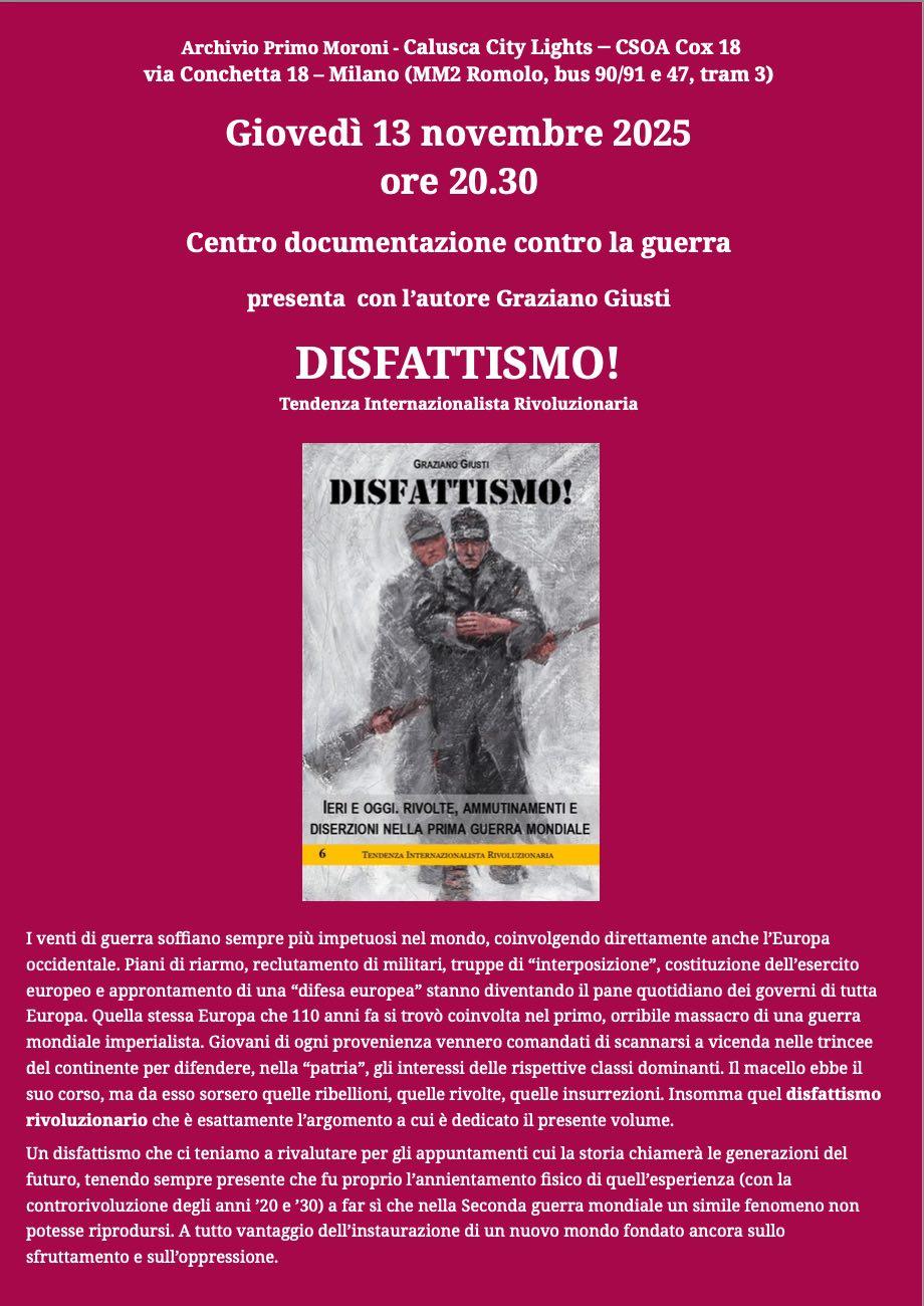 english below Archivio Primo Moroni – Calusca City Lights ─ CSOA Cox 18 via Conchetta 18 – Milano (MM2 Romolo, bus 90/91 e 47, tram 3) Giovedì 13 novembre 2025 ore 20.30 Centro documentazione contro la guerra presenta con l’autore Graziano Giusti D I S F A T T I S M O ! I venti di guerra soffiano sempre più impetuosi nel mondo, coinvolgendo direttamente anche l’Europa occidentale. Piani di riarmo, reclutamento di militari, truppe di “interposizione”, costituzione dell’esercito europeo e approntamento di una “difesa europea” stanno diventando il pane quotidiano dei governi di tutta Europa. […]