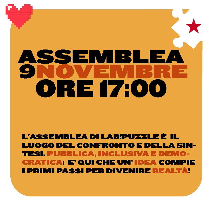 𝐋’𝐀𝐒𝐒𝐄𝐌𝐁𝐋𝐄𝐀L’assemblea di Lab!Puzzle è libera, pubblica, democratica, antifascista, antisessista e antirazzista, prerogative che riteniamo indispensabili per il vivere civile ed un confronto sano. Si tiene ogni prima domenica del mese alle ore 17:00, salvo quando diversamente specificato. 𝐎𝐑𝐃𝐈𝐍𝐄 𝐃𝐄𝐋 𝐆𝐈𝐎𝐑𝐍𝐎:L’odg si redige in mailing list ed è in continuo aggiornamento. Per iscriversi occorre partecipare ad almeno un’assemblea. modalità assembleari: crezione del report, moderator3 e verbalizzant3; condividiamo e rafforziamo buone pratiche.Uno striscione Palestina dove e quando?restituzione assemblea FoodNotBombsrestituzione del lavoro della bibliotechina Swartz GramsciUn assemblea condivisa tra i progetti atelier e coworking ed Ada; quali possibili sinergie?organizzazione Plenarissima: scegliere topic di […]
