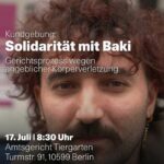 17.07.2025 – 08:30 | Amtsgericht Tiergarten, Turmstraße 91, Berlin-Moabit • 8:30 Uhr Kundgebung • 9:00 Uhr solidarische Prozessbegleitung Am Donnerstag um 9:00 Uhr steht unser:e Genoss:in Baki vor dem Amtsgericht Tiergarten. Um 8:30 Uhr ist eine Kundgebung vor dem Gerichtssaal angemeldet, die wir zusammen mit Palestine at the forefront abhalten, da auch ihr Genosse Ahmad zur selben vor Gericht steht in einem anderen Fall. Kommt zahlreich und unterstützt beide Aktivist:innen, die sich gegen den Genozid in Gaza stellen und dafür Repression abbekommen! ____ Baki Devrimkaya, angehendem Pflegeazubi und palästinasolidarische*r Aktivistin, steht vor Gericht wegen angeblicher Körperverletzung. Der Kläger ist einer […]