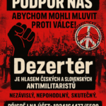 Zpravodaj Dezertér je časopisem českých a slovenských antimilitaristů a pacifistů. Jsme skutečně nezávislé médium, jeho vydávání financujeme z vlastních příspěvků a darů. Proto můžeme psát články proti válce, zbrojení a militarismu a nemusíme se bát, že nám je zablokuje cenzura vlastníků médií, jak je tomu běžnou praxí. A nebudeme si nalhávat naše protiválečné postoje se vládě, politikům a bohatým líbit nebudou. Naše finanční zdroje jsou omezené a skromné, jsme obyčejní pracující a studenti. Proto jestli ti přijde náš časopis a naše protiválečné myšlenky sympatické a chceš nám pomoci s vydáváním, aby mohl vycházet častěji a ve větším nákladu – podpoř […]