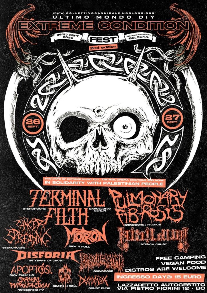 Il Collettivo Cannibale è molto dispiaciuto di presentare: 🔥 EXTREME CONDITION FEST – II Edizione 🔥📅 26-27 settembre 2025📍 Lazzaretto Autogestito, Via Pietro Fiorini 12 – BolognaBus dalla stazione: n.35 (fermata FACOLTÀ DI AGRARIA), oppure n.20 o N3 (fermata DELEDDA) Due giorni di musica estrema e contenuti condivisi in uno spazio libero e autogestito. Venerdì: dibattiti, proiezioni e confronto. A seguire, DJ set selvaggi con Zen Zero selecter e DJ fuckin’ Balli.Sabato: 11 band da Italia, Francia e USA, per una devastazione sonora ininterrotta dalle 16:00 a notte fonda. 🎶 SABATO 27 – LINE-UP 💸 Ingresso: 15 € (2 giorni) […]