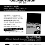 Due appuntamenti in occasione della ricorrenza dei cinquant’anni del Circolo Culturale Anarchico “Gogliardo Fiaschi” (Carrara, 25 e 29 luglio 2025) 50 ANNI DEL CIRCOLO CULTURALE ANARCHICO “GOGLIARDO FIASCHI” (1975 – 2025) Venerdì 25 lugliopresso “La Pala”, in via Emilia 32, località Castelpoggio (Carrara).Ore 18:00 – Presentazione della ristampa del libro Fòc al fòc! Goliardo Fiaschi: una vita per l’anarchia, edito dal Circolo Culturale Anarchico.Ore 20:00 – Cena.Ore 21:30 – Concerto dei Tower Harratz (RevengePunk da Bristol, UK). Martedì 29 luglioal Circolo Culturale Anarchico “Gogliardo Fiaschi”, in via Ulivi 8/B, Carrara.Ore 18:00 – Aperitivo a sostegno delle attività del circolo. In […]