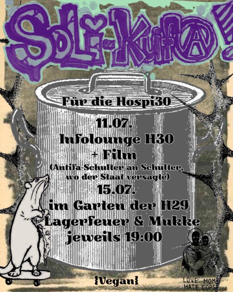 ❗️Aufgepasst!❗️Am Freitag den 11.07. und Dienstag den 15.07. veranstalten wir jeweils eine Soli-KüfA, um Geld zu sammeln. Also kommt rum für leckeres Essen und das ein oder andere Spaßgetränk am Lagerfeuer für n anständigen Zweck. ⏰Freitag ab 19:00 in der InfoLounge H30, anschließend wird der Film „ANTIFA – Schulter an Schulter, wo der Staat versagte“ gezeigt ⏰Dienstag ab 19:00 findet die Küfa im Garten der Hospi29 statt Das Geld geht an die Hospi30 und die anderen von Repression betroffenen Antifaschist*innen nach der Razzia. Kommt vorbei und bringt Freund*innen mit!