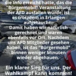 Trotz offizieller Absage der AfD waren sie heute doch am angekündigten Parkplatz. Damit haben wir natürlich gerechnet und waren mit einigen Personen vor Ort.Wir mussten nicht mehr tun, als präsent zu sein, um unser Ziel zu erreichen. Die beiden AfD Mitglieder stiegen, nachdem sie uns entdeckt hatten, sofort in ihr Auto und traten den Rückzug an. Die Vorarbeit, die wir in den letzten Jahren bei den AfD-Ständen etc. geleistet haben, trägt eindeutig Früchte.