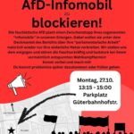 Am Montag, 27. Oktober fährt die AfD in Erlangen vor, mit ihrem sogenannten Infomobil. Sie wollen hier ihre Propaganda unter die Leute bringen und wir wollen das verhindern.Schließ dich uns an, komm um 13:15 Uhr zum Parkplatz an der Güterhallenstraße und lass uns klarmachen, die AfD hat hier, genau wie überall, sonst keinen Platz