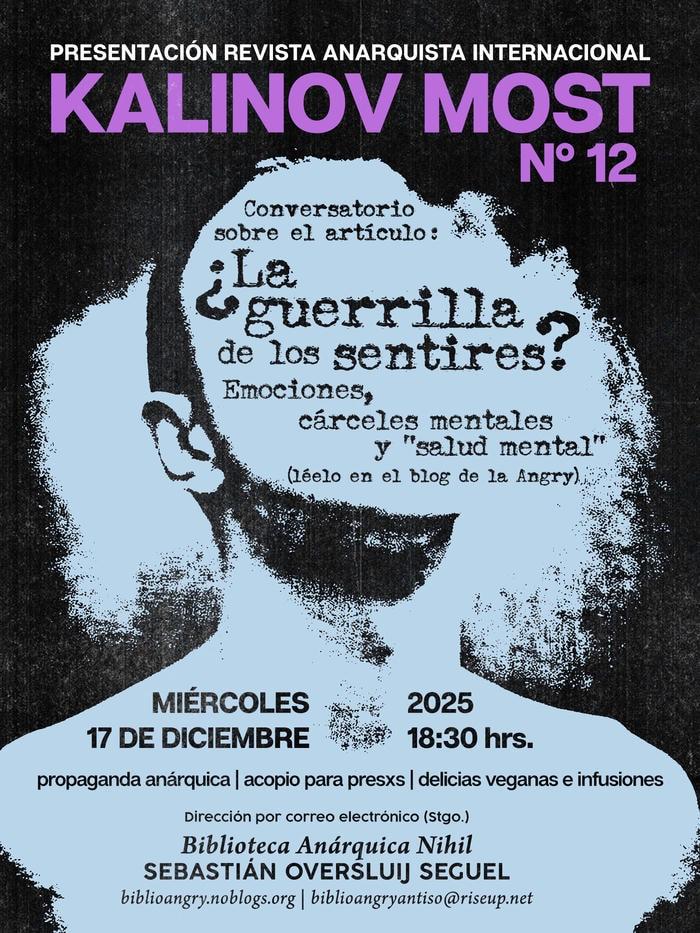 Miércoles 17 de diciembre 2025 – 18:30 hrs.Dirección por correo electrónico (Stgo.) Conversatorio en torno al artículo: ¿La guerrilla de los sentires? Emociones, cárceles mentales y «salud mental»Un texto que navega entre los cuestionamientos y defensa de la psiquiatría, la salud mental, el suicidio o las narrativas de cárceles mentales, abordando una temática extremadamente vigente durante los últimos años en el territorio chileno. Cuestiona la centralidad de ciertos conceptos o lugares comunes que han conseguido transformar la lucha contra el sistema en nada menos que su propio sostén. Puedes leer este texto completo acá: ¿La guerrilla de los sentires? Emociones, […]