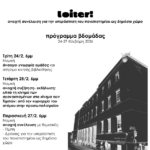 Τρίτη 24/2 – άνοιγμα-γνωριμία ομάδας και στήσιμο κινητής βιβλιοθήκης. Τετάρτη, 25/02 – ανοιχτή συζήτηση-εκδήλωση: “Από τη κίνημα των αγανακτισμένων στο κίνημα των Τεμπών: από την κυριαρχία του ατόμου στην προσωπολατρεία”. Παρασκευή 27/02 – ανοιχτή συνέλευση