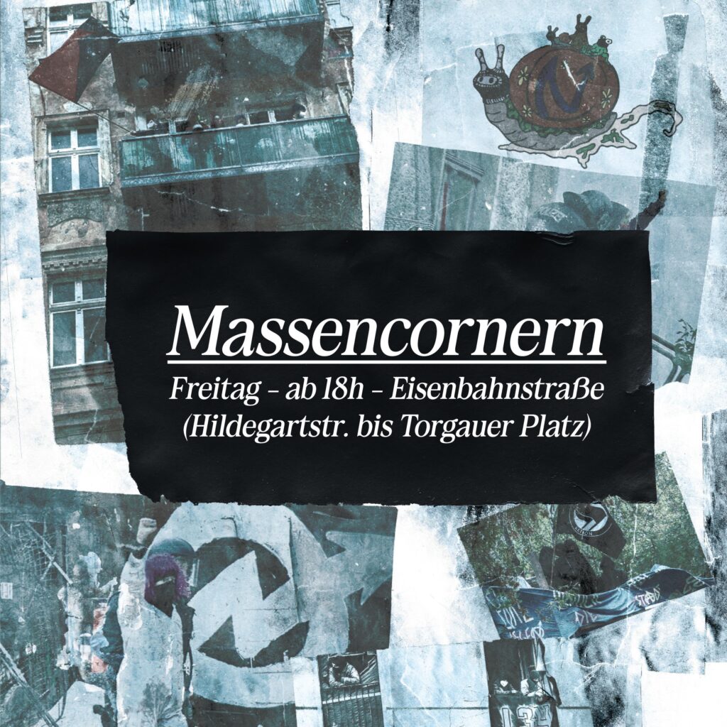 Wir haben eine Ankündigung erhalten, die wir euch natürlich nicht vorenthalten wollen. Am Freitag, 17.10. ab 18 Uhr soll es ein großes Cornern auf der Eisenbahnstraße – Hildegardstraße bis Torgauer Platz – geben. Kommt doch vorbei! Hier haben wir es gelesen: https://de.indymedia.org/node/545359 „Die Bullen haben jetzt alle Häuser geräumt. Das Henri im Westen und die Villa Krause und das Eineck im Osten. Jeder Versuch sich außerhalb kapitalistischer Zwänge zu organisieren und gemeinschaftliche Lösungen weg von Kontrolle und Herrschaft für unsere Probleme zu finden, wird auf kurz oder lang von der Polizei angegriffen. Alle neuen und alten unkommerziellen Räume werden geräumt […]