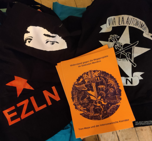 Neu im Infoladen Schwarzmarkt: Broschüre “Widerstand gegen die Megaprojekte im Südosten Mexikos – Tren Maya und der Interozeanische Korridor” der Recherche-AG und Zapatistas / EZLN Soli-Stoffbeutel Auch bei uns im Infoladen Schwarzmarkt in großer Auswahl erhältlich: Soli-T-Shirts “selbstverständlich antifaschistisch” in vielen Größen und Farben von Family and Friends Hamburg für die Budapest-Verfahren