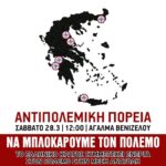 ⒶΝΑ ΜΠΛΟΚΑΡΟΥΜΕ ΤΟΝ ΠΟΛΕΜΟ Αντιπολεμική Πορεία Σάββατο 28/3, 12:00, Άγαλμα Βενιζέλου Ένας κόσμος που μαστίζεται από τον πόλεμο και τον θάνατο… H συνεχής κλιμάκωση του πολέμου στην Μέση Ανατολή μετά την επίθεση ΗΠΑ-ΝΑΤΟ-Ισραήλ στο Ιράν. Η γενοκτονία που συνεχίζει να διαπράττει το σιωνιστικό Κράτος του Ισραήλ στην Παλαιστίνη. Οι μαζικές σφαγές του εμφυλίου πολέμου στο Σουδάν. Η εισβολή της Ρωσίας και ο πόλεμος στην Ουκρανία. Η επίθεση των αναβαπτισμένων τζιχαντιστών της Συριακής Κυβέρνησης στην Ροζάβα. Οι εκατοντάδες νεκροί της εξέγερσης στο Ιράν και οι θανατηφόρες φασιστικές πρακτικές του ICE στις ΗΠΑ. Τα αμέτρητα νεκρά κορμιά μεταναστ(ρι)ών στην Μεσόγειο. Οι απειλές […]