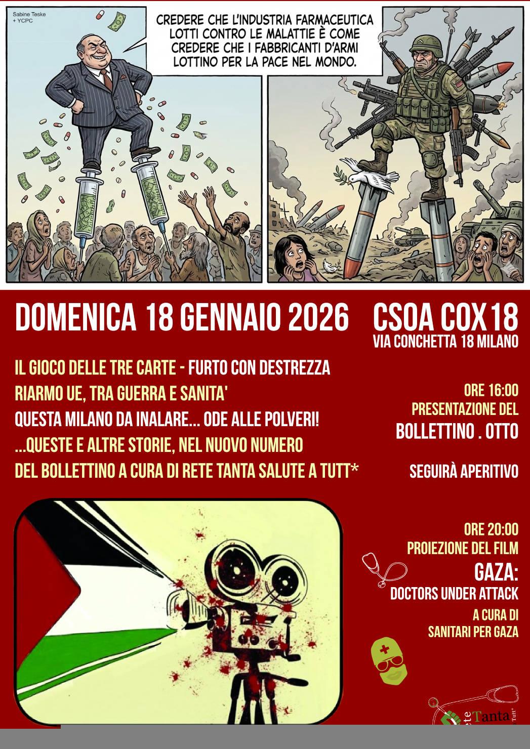 MERCOLEDI’ 14 GENNAIO Chi fa da sé fa per tre ore 20.30 proiezione del film To Kill a War Machine [documentario, regia di Hannan Majid e Richard York, GB, 2025, 1h 18m] Il film, To Kill a War Machine, tratta delle azioni dirette in Gran Bretagna del gruppo Palestine Action contro Elbit System, azienda israeliana produttrice d’armi, e contro aziende complici di israele.[…] DOMENICA 18 GENNAIO – Rete Tanta salute a Tutti/e – Sanitari per Gaza – Csoa Cox 18 ore 16.00: – Presentazione del Bollettino n. 8 della Rete Tanta salute a Tutti/e; ore 19.30 aperitivo; ore 20.00 proiezione: […]