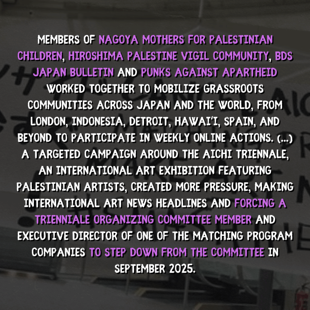[IG version] #SMASHTHEMATCH Campaign Wins Cancellation of Aichi-Israel Matching Program in Japan November 21, 2025 #SMASHTHEMATCH campaign organizers are proud to announce the official END to the Aichi-Israel Matching Program, as declared by the Aichi Prefectural government and reported by Chunichi Shinbun and Asahi Shinbun on November 18, 2025. This a massive WIN for the grassroots BDS movement in Japan. Apartheid Isrl continues to violate the so-called “ceasefire” with drone strikes and bombings, selling their advanced genocidal weaponry around the globe. As the Japanese government continues to normalize relations with Isrl, especially in cybersecurity and technology, we recognize the importance…