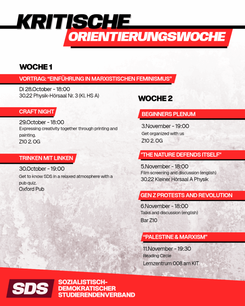 Du bist neu an der Uni und interessierst dich für politische Themen? Du willst mehr über sozialistische Ideen erfahren und dich aktiv engagieren? Dann bist du bei unserer Alternativen Kritischen Orientierungsphase (A-Phase) genau richtig! Wir, der sozialistisch-demokratische Studierendenverband (SDS), laden alle neuen Studierenden ein, sich über unsere Arbeit zu informieren, uns kennenzulernen und aktiv in den politischen Austausch einzutauchen. Egal, ob du schon erste politische Erfahrungen hast oder einfach neugierig bist – bei uns bist du herzlich willkommen! Alle kurzfristigen Änderungen werden wir rechtzeitig bekanntgeben. Das volle Programm und alle Infos findest du unter https://sdska.noblogs.org/a-phase/. Komm vorbei, lerne uns kennen […]