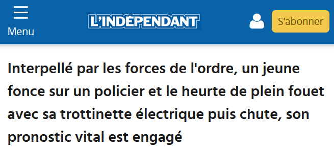 Interpellé par les forces de l’ordre, un jeune fonce sur un policier et le heurte de plein fouet avec sa trottinette électrique puis chute, son pronostic vital est engagé (Anti.MÉDIA)